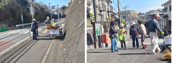 3月を迎えて春の息吹を感じる季節となりました、睦会(老人会)では緑化・道路清掃などの活動を積極的に進めています。2月28日(土)は月例の道路清掃活動として、自治会館前から跨線橋までのバス通りを清掃しました。緑化活動では皇帝ダリアの苗育てを実施中、さらに第3公園脇の花壇奥に今年はジャガイモを植え付けるべく、土づくりを行いました、子ども達とコラボして植え付け・収穫する予定です。