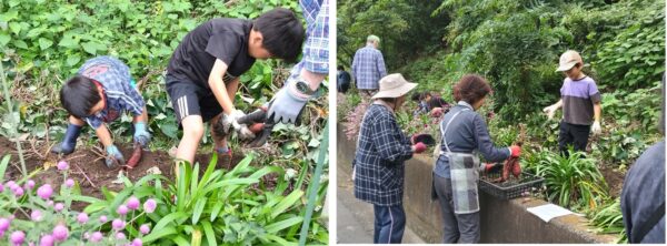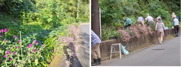 写真1:現場では30分前から睦会メンバーが準備作業、センニチコウが鮮やかです