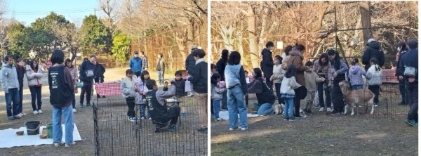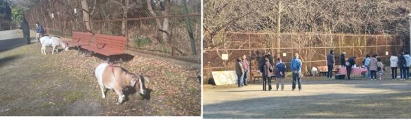 子ども達とヤギさんのふれ合い会が開かれました、場所は第5公園(ゴリラ公園)1月18日(日)、参加してくれたヤギさんはメイ太君とクリちゃん、2020,21年生まれの「トカラヤギ」さんで12時半ころ現場に到着、会場を設営し13時からふれ合い会となりました